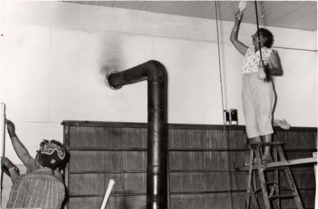 Library painting ceiling: Zinna Zwainz and Mildred Magnuson. Photograph scraped from the Beautification Scrapbooks held by Reardan Memorial Library.