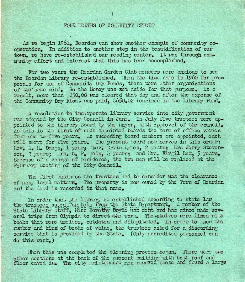 from Memorial Library scrapbook held by the Reardan Memorial Library.
