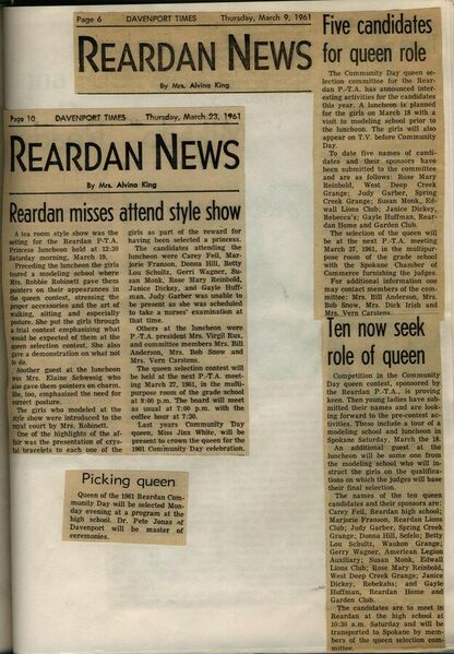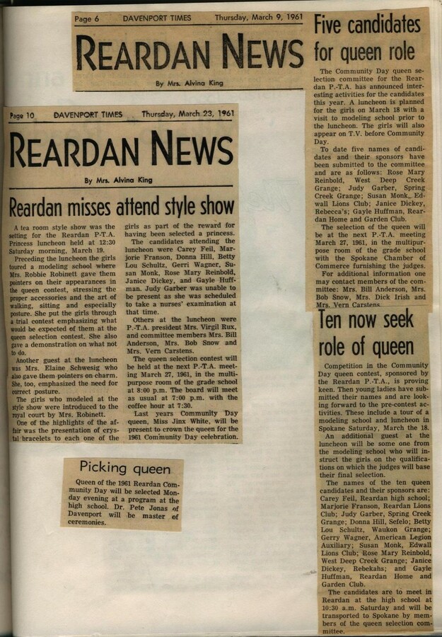 This page is from a scrapbook held by the Reardan Memorial Library about the Reardan Royalty. 1961 royalty 006