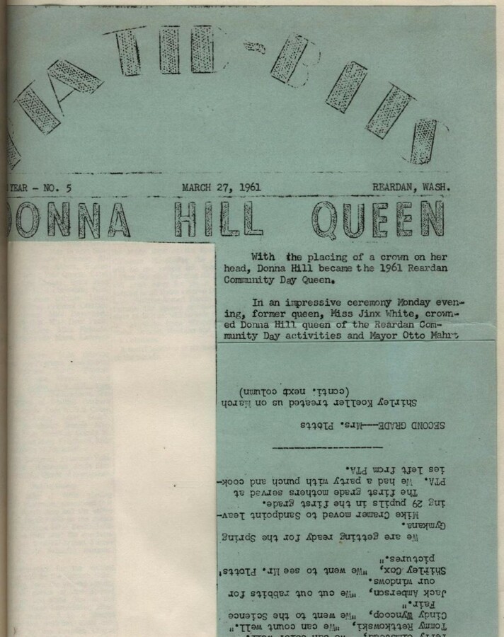 This page is from a scrapbook held by the Reardan Memorial Library about the Reardan Royalty. 1961 royalty 008