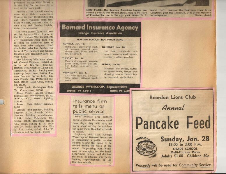 Davenport Times article on new flag for Reardan, ad for pancake breakfast and lunch menu by Barnard Insurance Agency. Part of the Beautification Scrapbooks held by the Reardan Memorial Library.