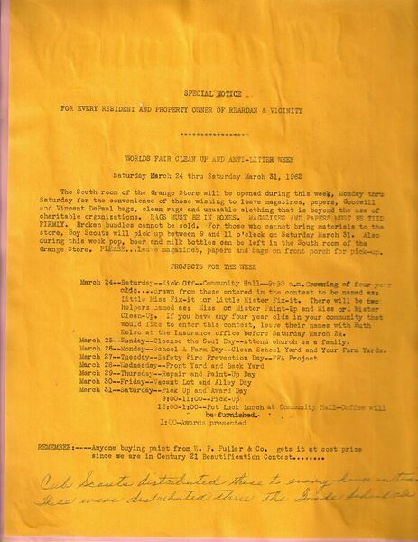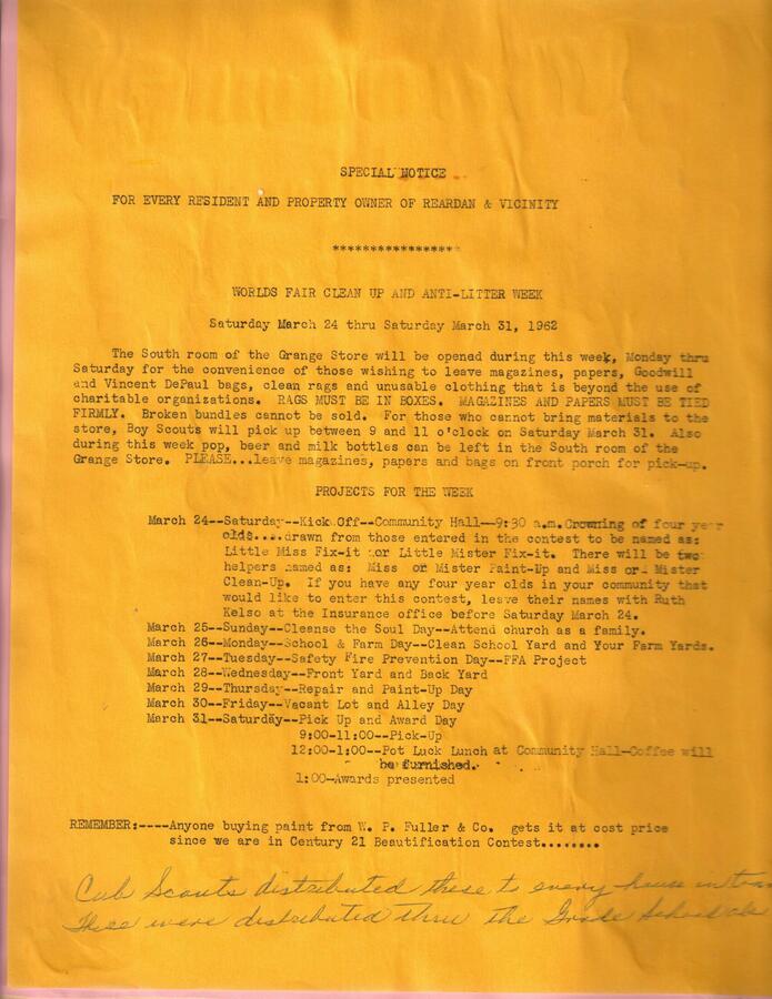 Notice of spring cleanup. Part of the Beautification Scrapbooks held by the Reardan Memorial Library.