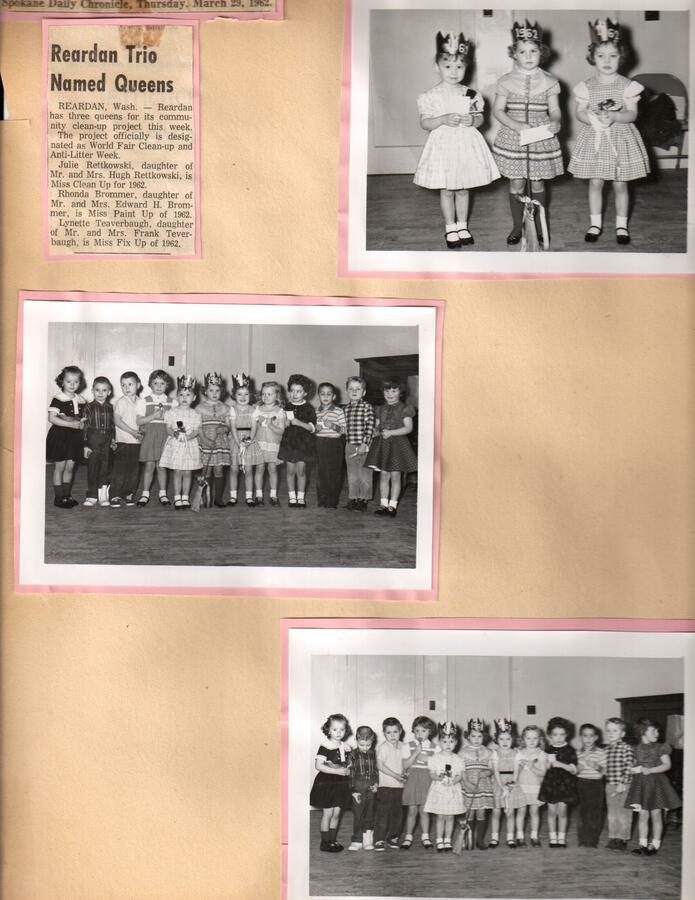 Photos of five yearr-olds to be Queens, Spokane Chronicle article about same. Part of the Beautification Scrapbooks held by the Reardan Memorial Library.