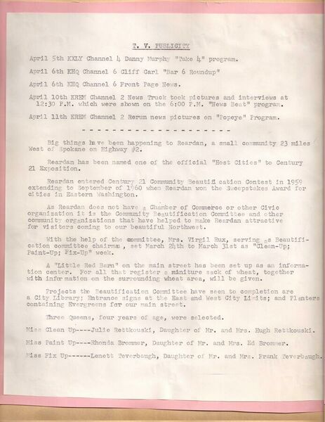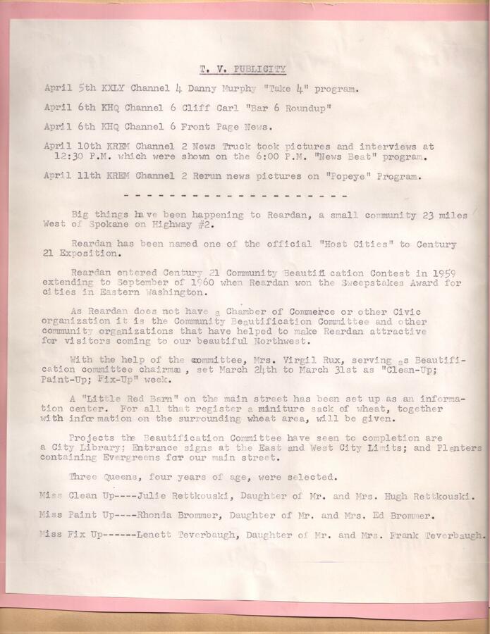 TV publicity notice. Part of the Beautification Scrapbooks held by the Reardan Memorial Library.