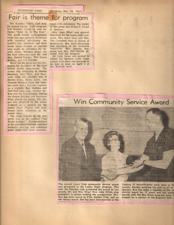 Davenport Tines article about Lions program and community service award to Virgil and Mary Rux. Part of the Beautification Scrapbooks held by the Reardan Memorial Library.