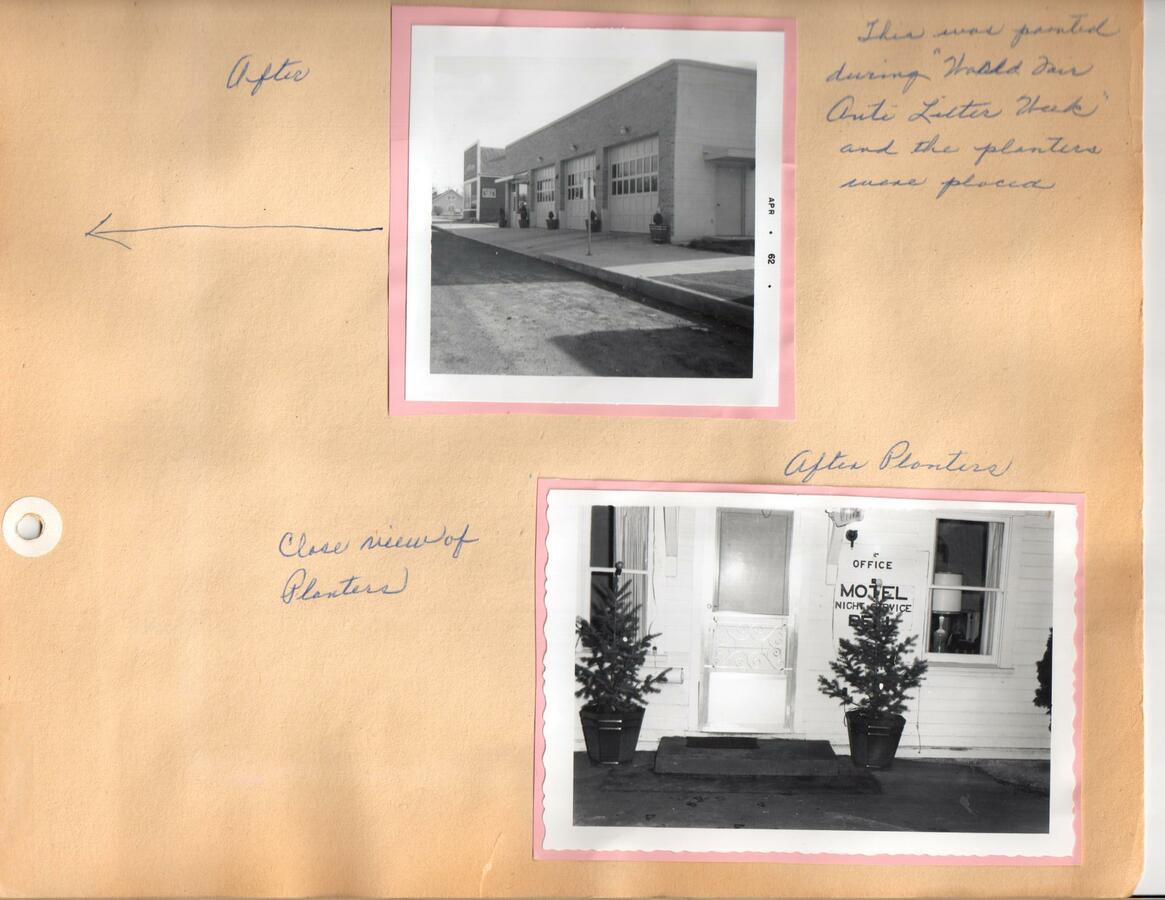 Photo of planters at Clinton's Motel and fire station. Part of the Beautification Scrapbooks held by the Reardan Memorial Library.