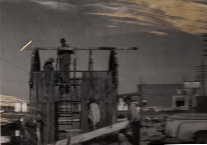 Delivery of red barn. Photograph scraped from the Beautification Scrapbooks held by Reardan Memorial Library.