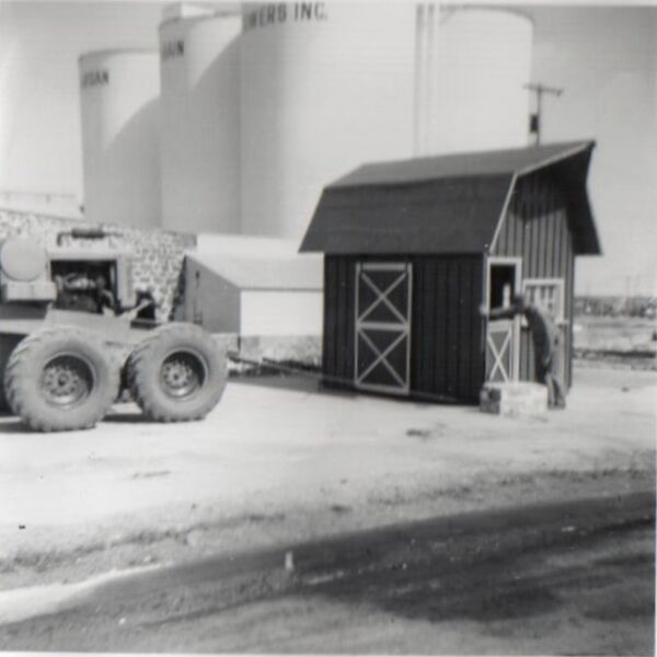 Road grader, red barn, and elevators. Photograph scraped from the Beautification Scrapbooks held by Reardan Memorial Library.