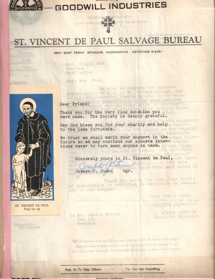 Thank you letter from St. Vincent DePaul. Part of the Beautification Scrapbooks held by the Reardan Memorial Library.