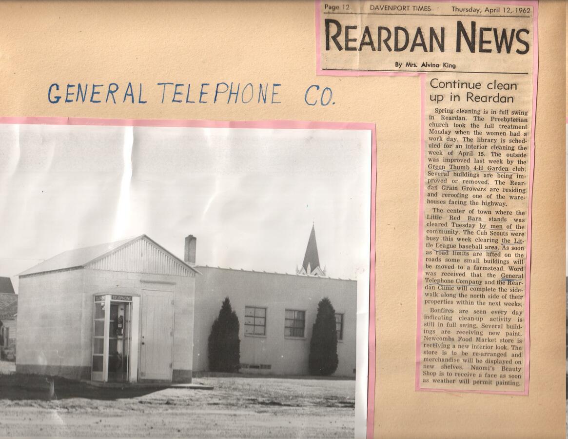 Photo of General Telephone switching building, Davenport Times article about cleanup. Part of the Beautification Scrapbooks held by the Reardan Memorial Library. [Category: General Telephone]]