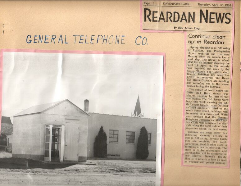 Photo of General Telephone building, Davenport Times article about cleanup. Part of the Beautification Scrapbooks held by the Reardan Memorial Library.