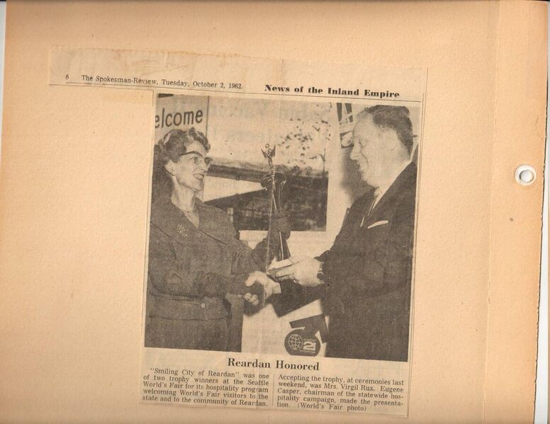 Spokesman-Review article about Reardan getting hospitality award. Part of the Beautification Scrapbooks held by the Reardan Memorial Library.