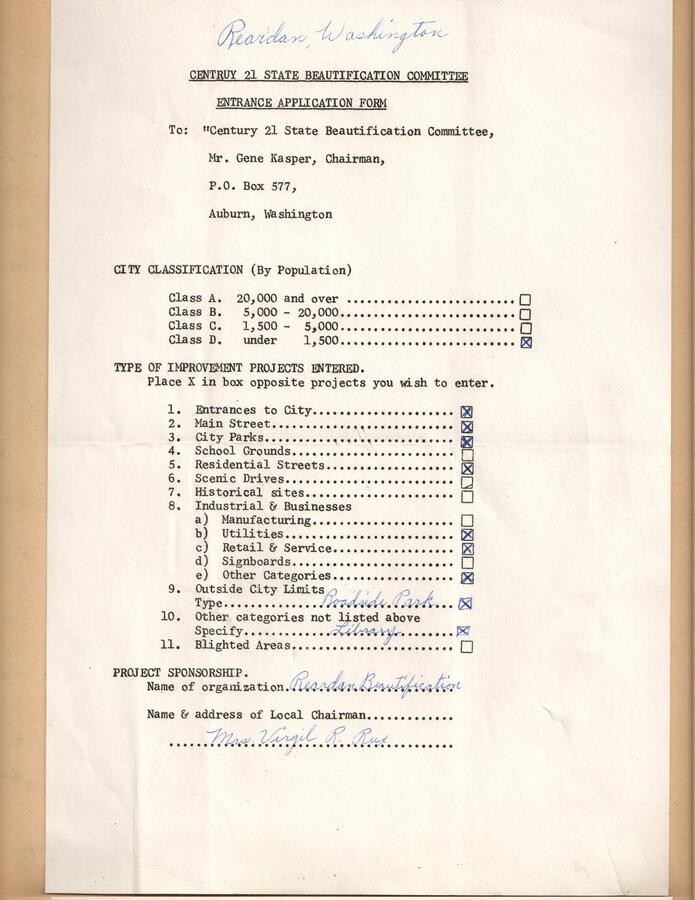 Application for beautification contest. Part of the Beautification Scrapbooks held by the Reardan Memorial Library.