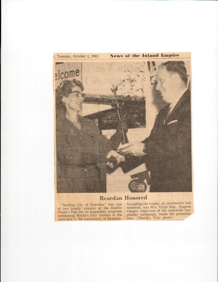 Spokesman-Review article about Reardan getting hospitality award. Part of the Beautification Scrapbooks held by the Reardan Memorial Library.