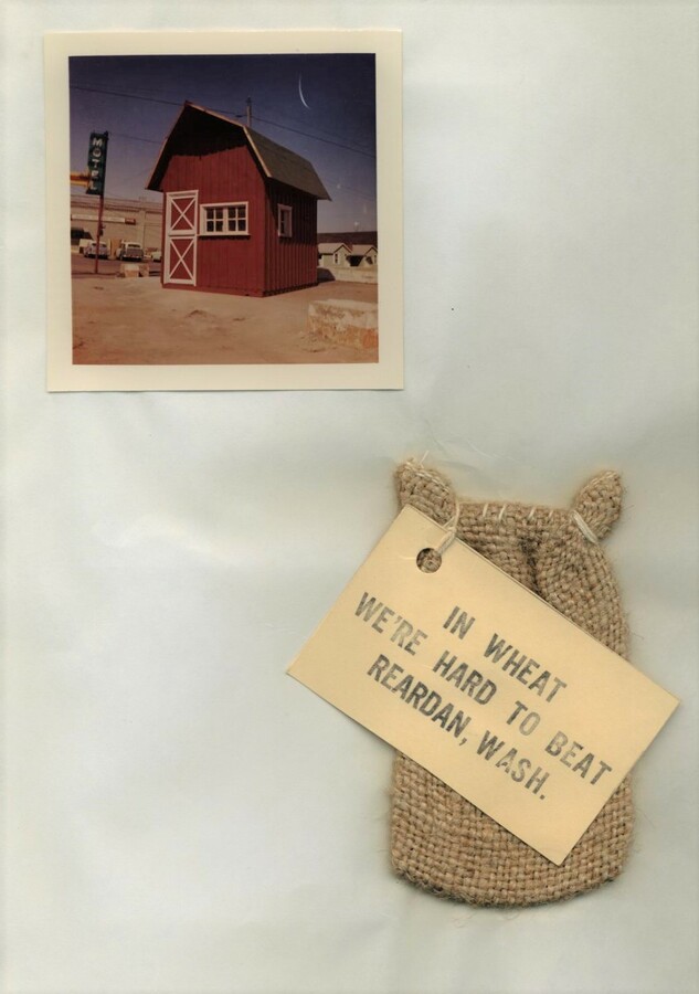 Photo of red barn and sack of wheat. Part of the Beautification Scrapbooks held by the Reardan Memorial Library.