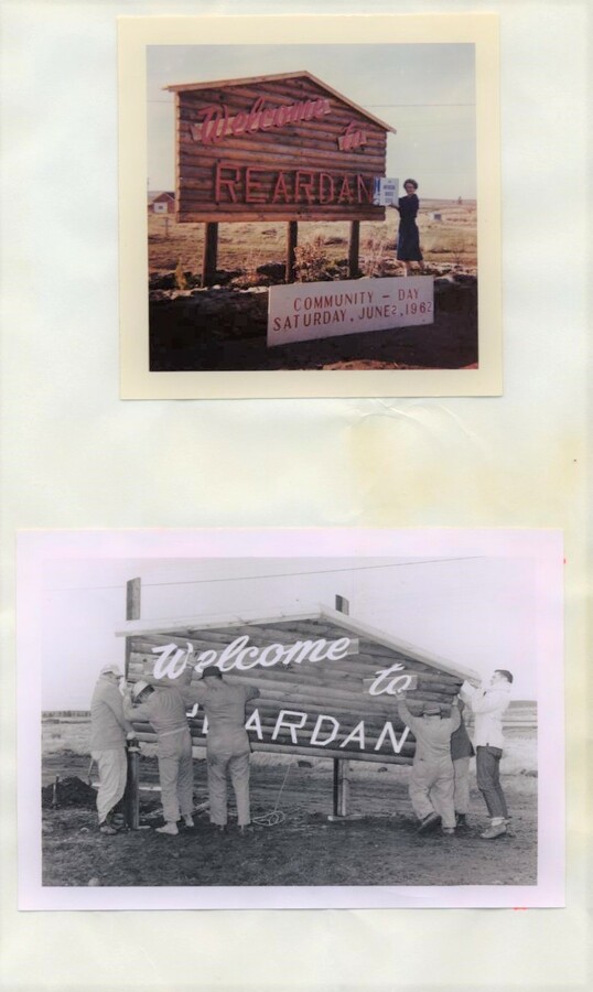 Photo of moving the welcome sign. Part of the Beautification Scrapbooks held by the Reardan Memorial Library.
