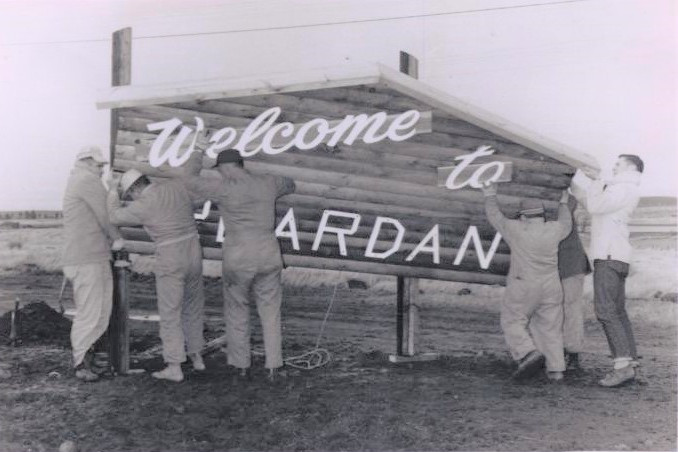 Raising Welcome to Reardan sign. Photograph scraped from the Beautification Scrapbooks held by Reardan Memorial Library.