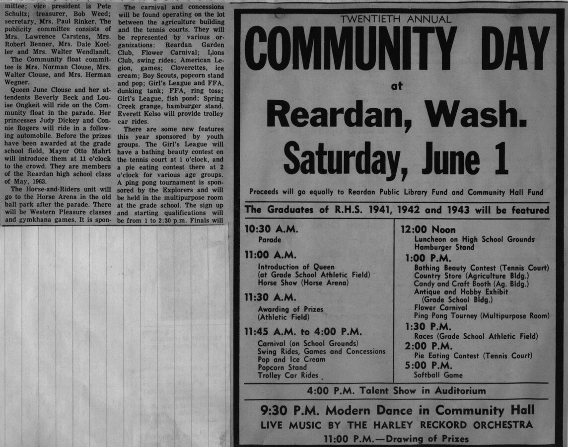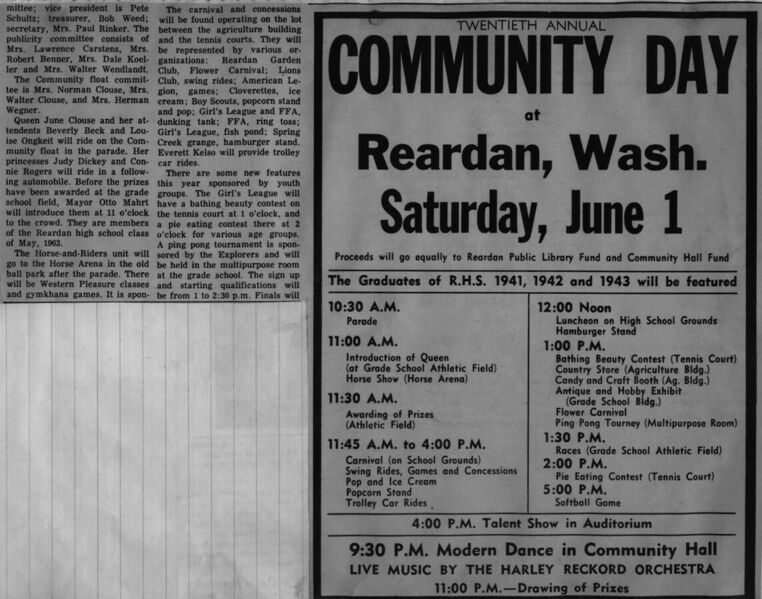 This page is from a scrapbook held by the Reardan Memorial Library about the Reardan Royalty. 1963 royalty 002