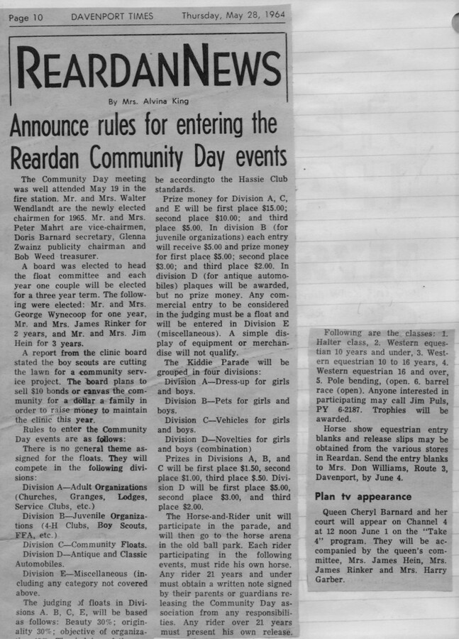 This page is from a scrapbook held by the Reardan Memorial Library about the Reardan Mule Days. 018