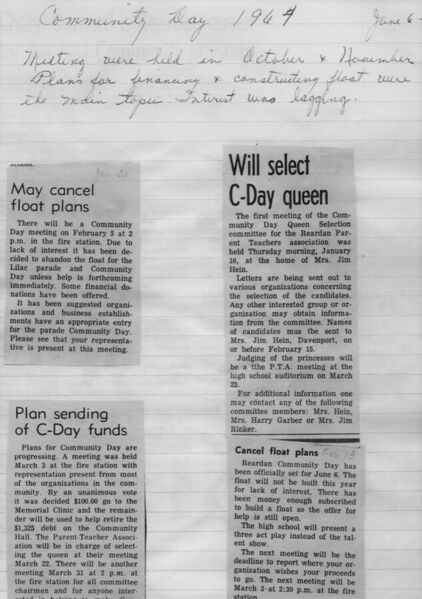 This page is from a scrapbook held by the Reardan Memorial Library about the Reardan Royalty. 1964 royalty 000