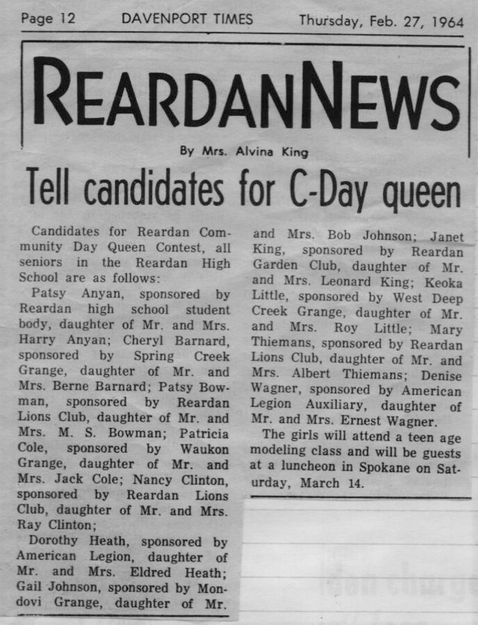 This page is from a scrapbook held by the Reardan Memorial Library about the Reardan Royalty. 1964 royalty 001