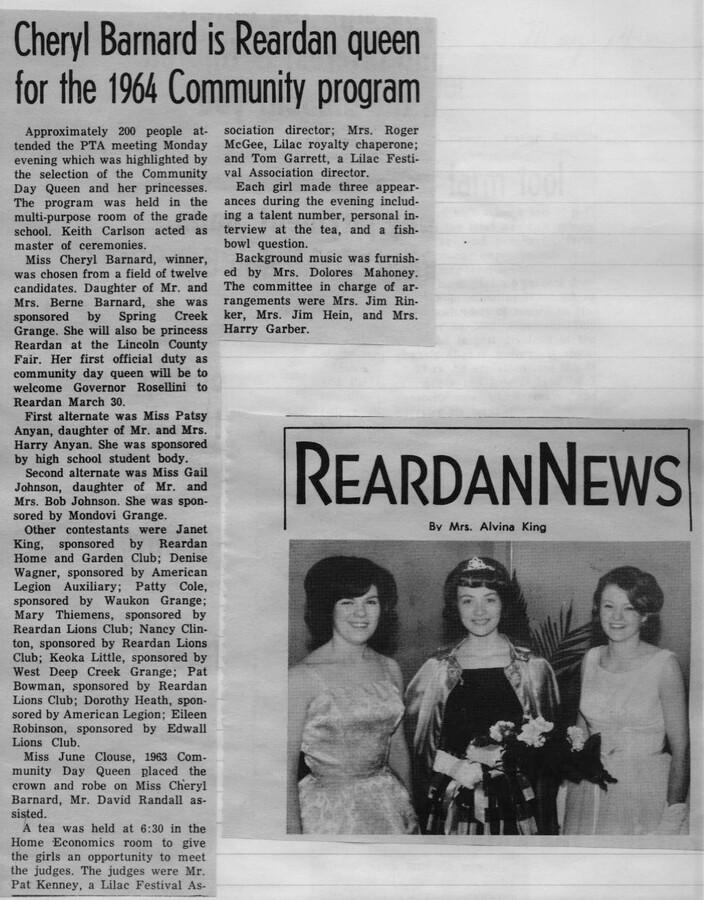 This page is from a scrapbook held by the Reardan Memorial Library about the Reardan Royalty. 1964 royalty 002