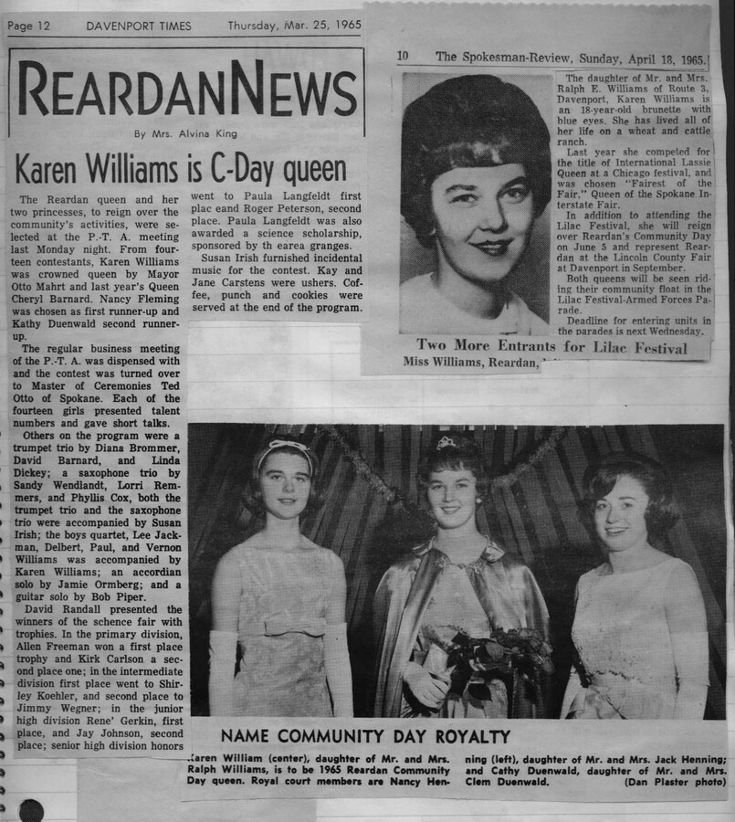 This page is from a scrapbook held by the Reardan Memorial Library about the Reardan Royalty. 1965 royalty 003