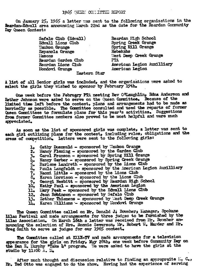 This page is from a scrapbook held by the Reardan Memorial Library about the Reardan Royalty. 1965 royalty 008