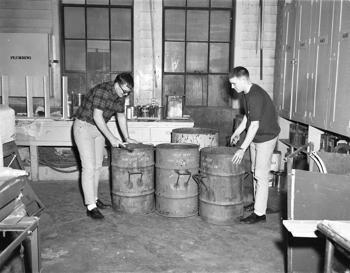 1966 FFA photo of trash barrel project in shop area. (Photo by Dan Plaster)