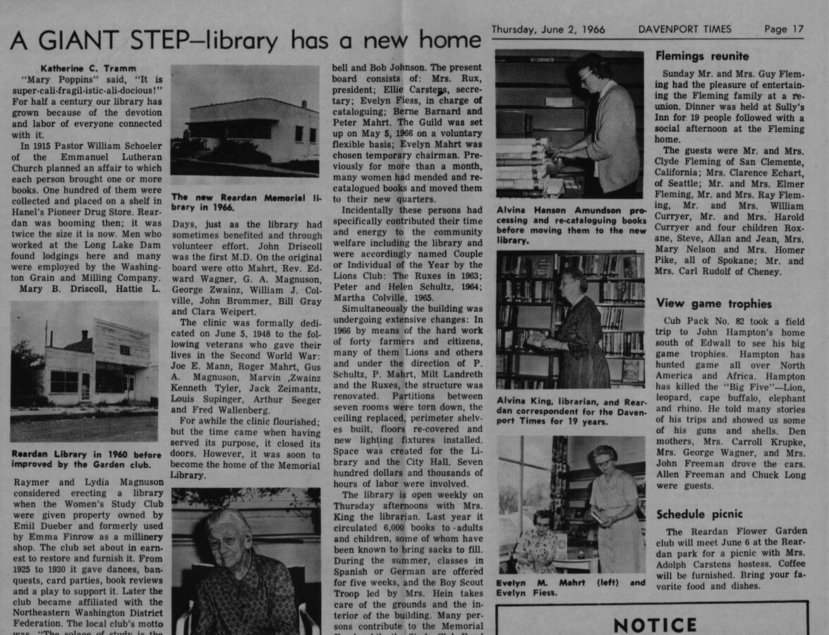 from Memorial Library scrapbook held by the Reardan Memorial Library.