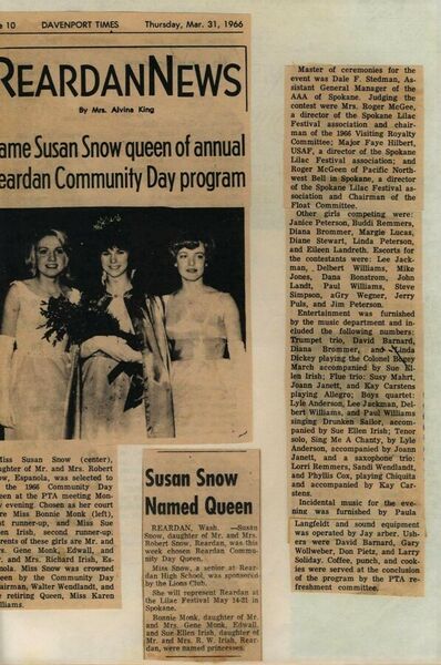 This page is from a scrapbook held by the Reardan Memorial Library about the Reardan Royalty. 1966 royalty 002