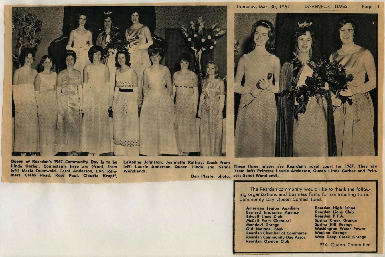 This page is from a scrapbook held by the Reardan Memorial Library about the Reardan Royalty. 1967 royalty 006