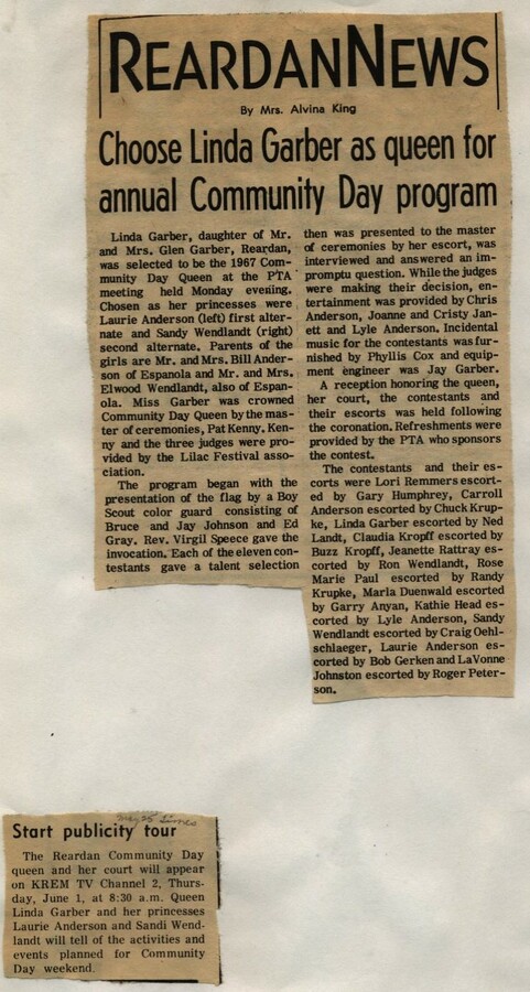 This page is from a scrapbook held by the Reardan Memorial Library about the Reardan Royalty. 1967 royalty 008