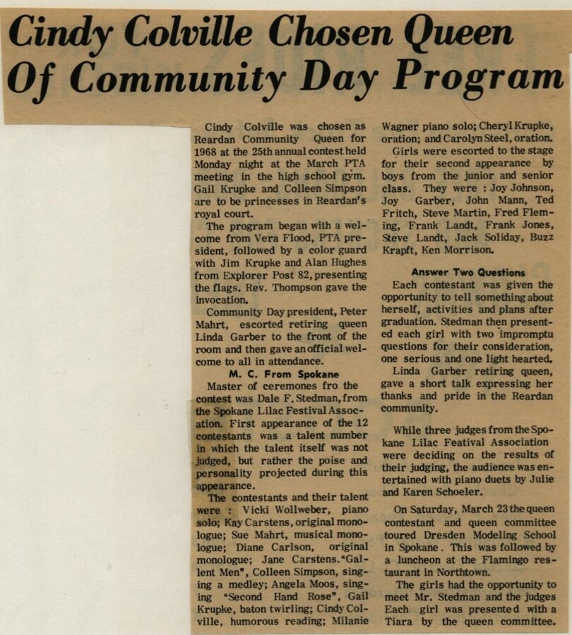 This page is from a scrapbook held by the Reardan Memorial Library about the Reardan Royalty. 1968 royalty 005