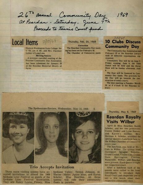 This page is from a scrapbook held by the Reardan Memorial Library about the Reardan Royalty. 1969 royalty 000