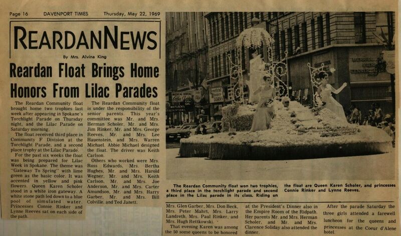This page is from a scrapbook held by the Reardan Memorial Library about the Reardan Royalty. 1969 royalty 004