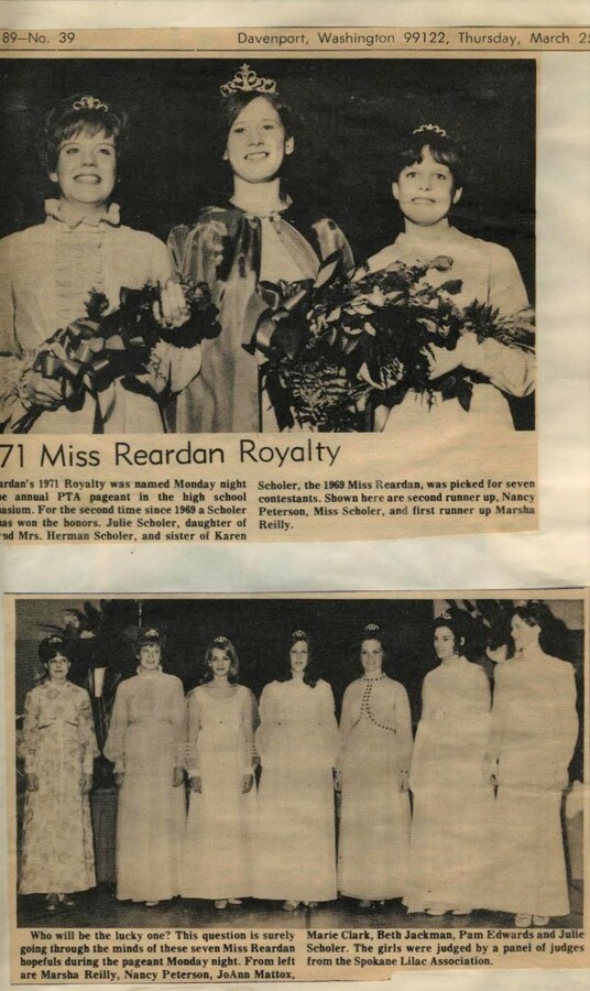 This page is from a scrapbook held by the Reardan Memorial Library about the Reardan Royalty. 1971 royalty 008