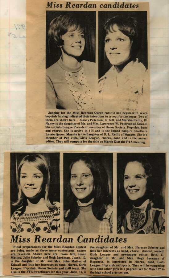This page is from a scrapbook held by the Reardan Memorial Library about the Reardan Royalty. 1971 royalty 012