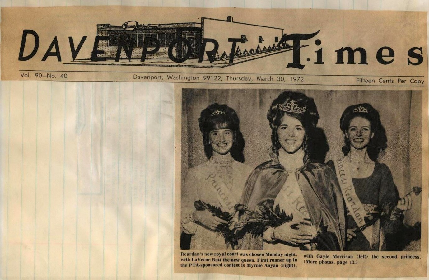 This page is from a scrapbook held by the Reardan Memorial Library about the Reardan Royalty. 1972 royalty 000