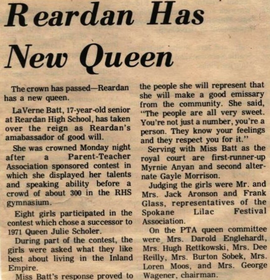 This page is from a scrapbook held by the Reardan Memorial Library about the Reardan Royalty. 1972 royalty 003