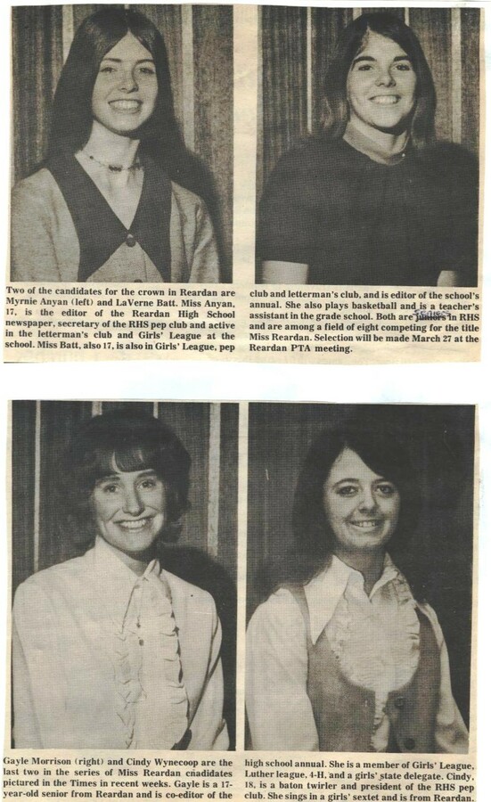 This page is from a scrapbook held by the Reardan Memorial Library about the Reardan Royalty. 1972 royalty 004