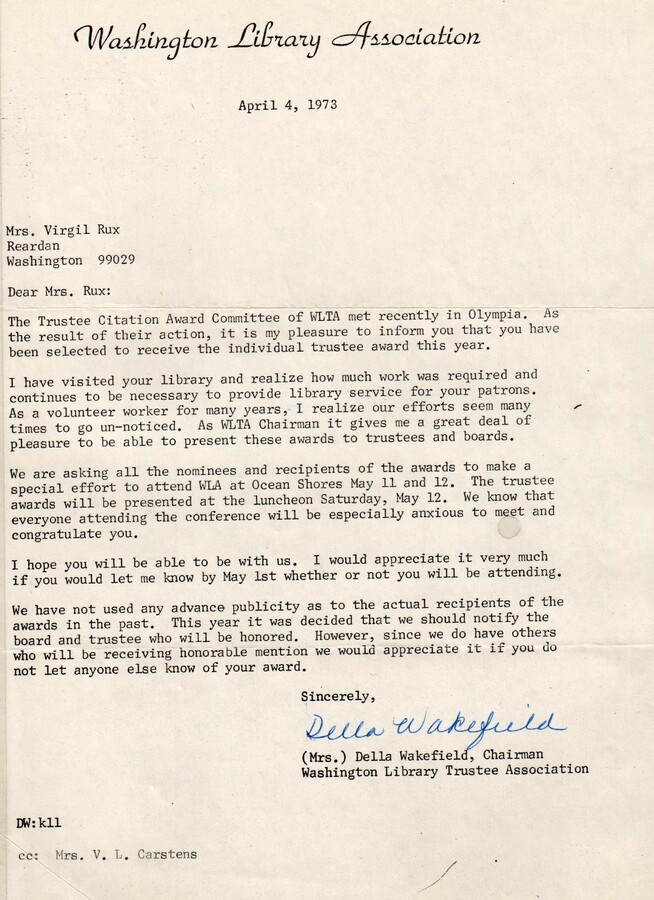 from Memorial Library scrapbook held by the Reardan Memorial Library.