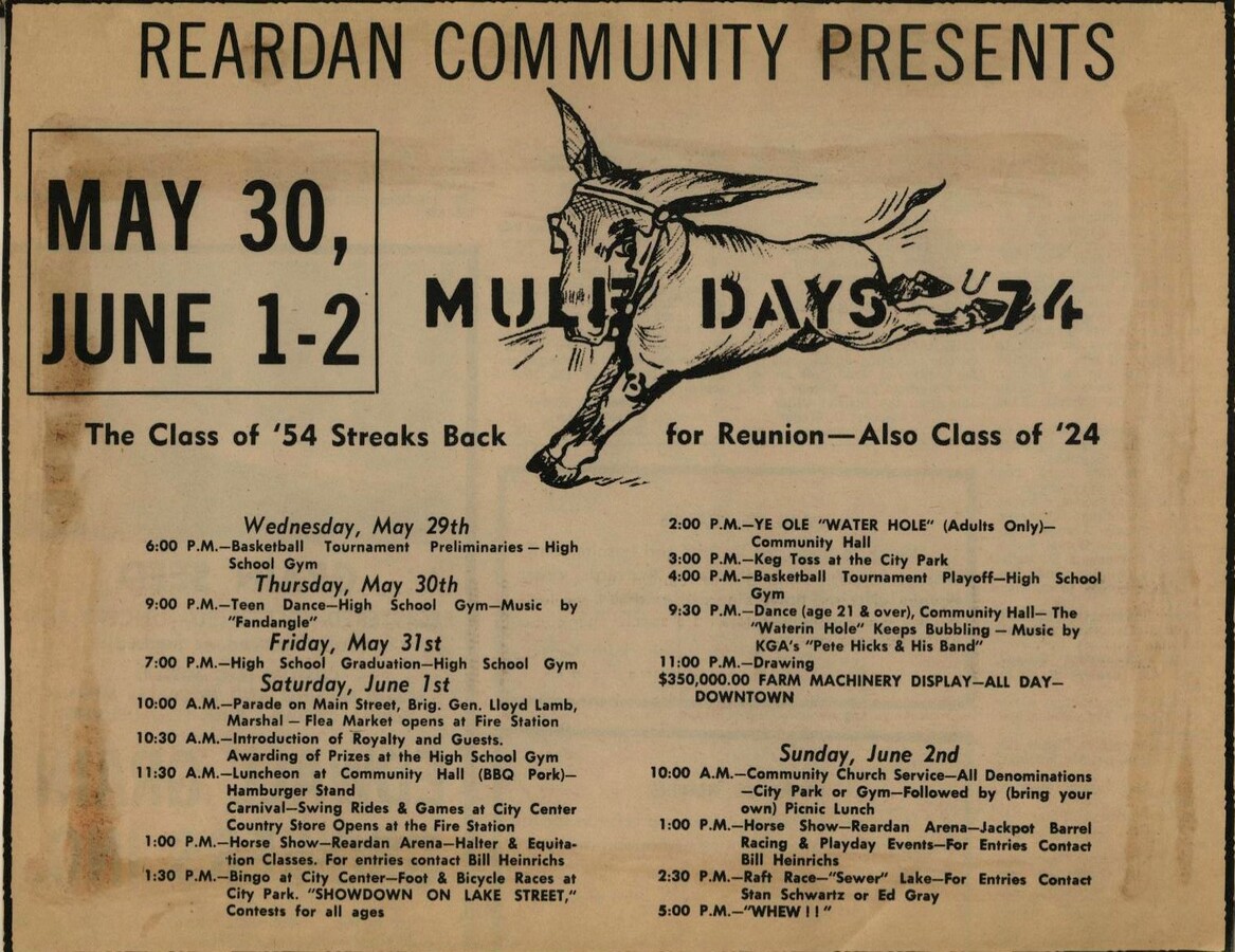 This page is from a scrapbook held by the Reardan Memorial Library about the Reardan Mule Days. 021