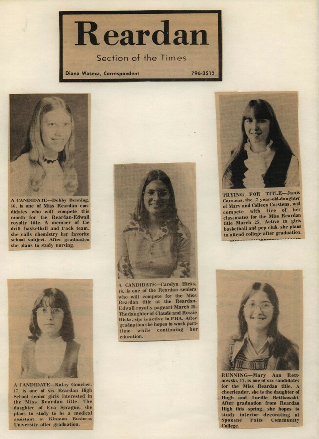 This page is from a scrapbook held by the Reardan Memorial Library about the Reardan Royalty. 1974 royalty 002