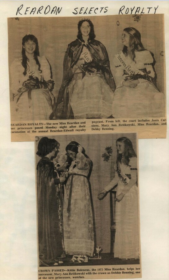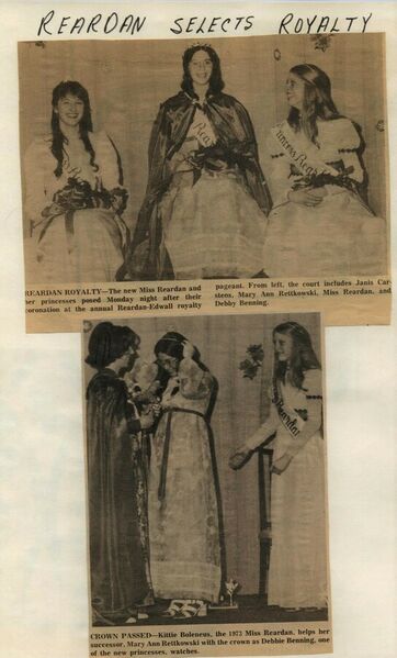 This page is from a scrapbook held by the Reardan Memorial Library about the Reardan Royalty. 1974 royalty 005