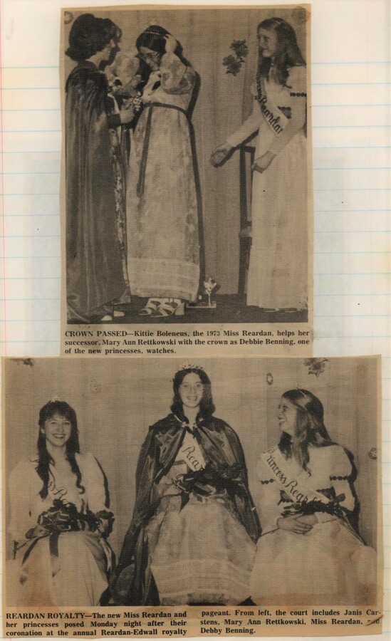 This page is from a scrapbook held by the Reardan Memorial Library about the Reardan Royalty. 1974 royalty 016