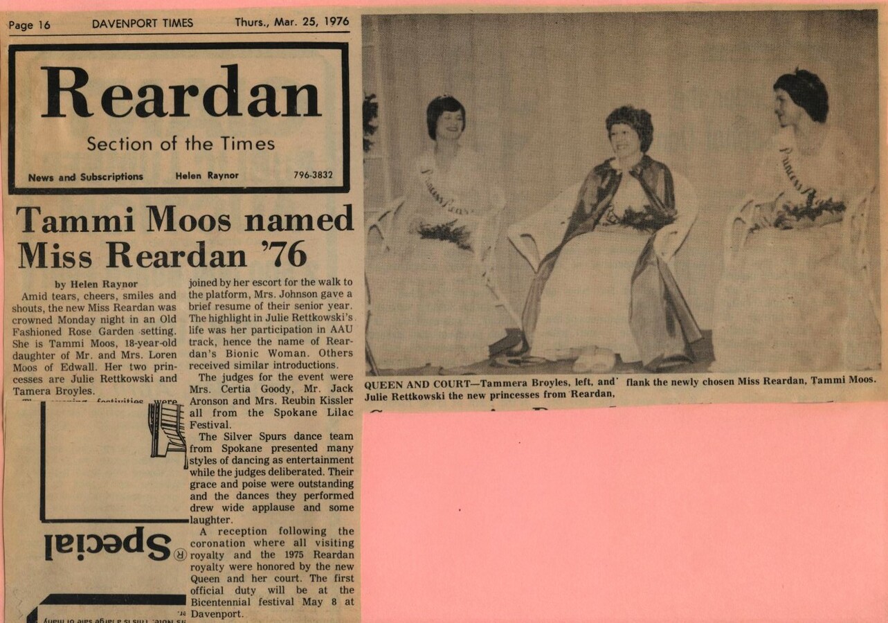 This page is from a scrapbook held by the Reardan Memorial Library about the Reardan Royalty. 1976 royalty 010