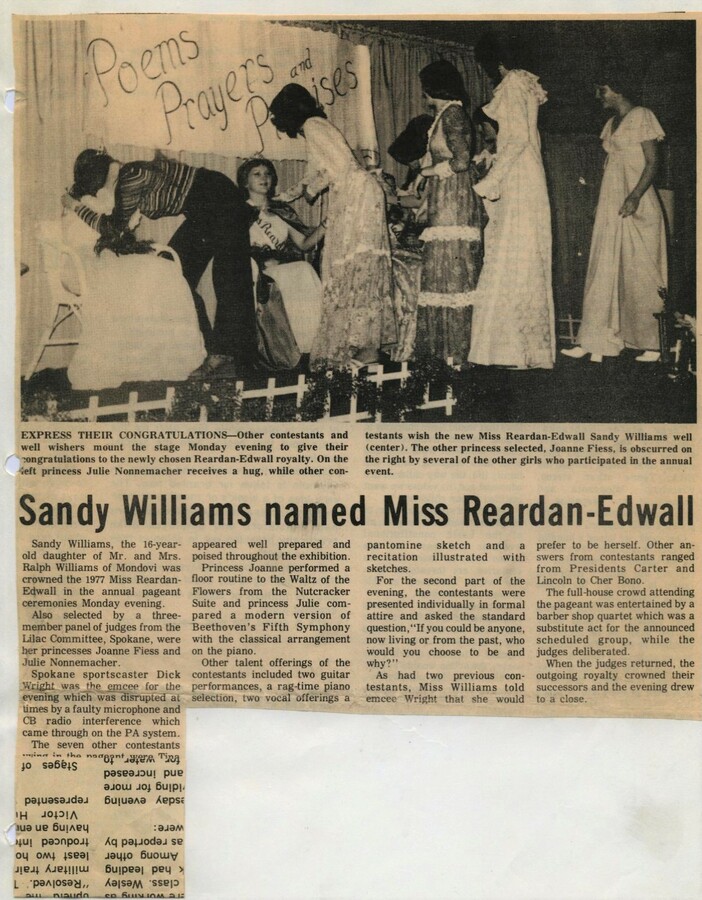 This page is from a scrapbook held by the Reardan Memorial Library about the Reardan Royalty. 1977 royalty 016
