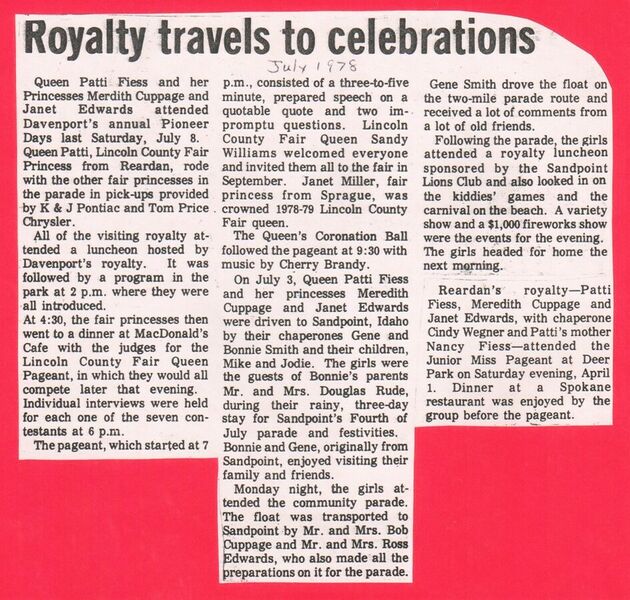This page is from a scrapbook held by the Reardan Memorial Library about the Reardan Royalty. 1978 royalty 009