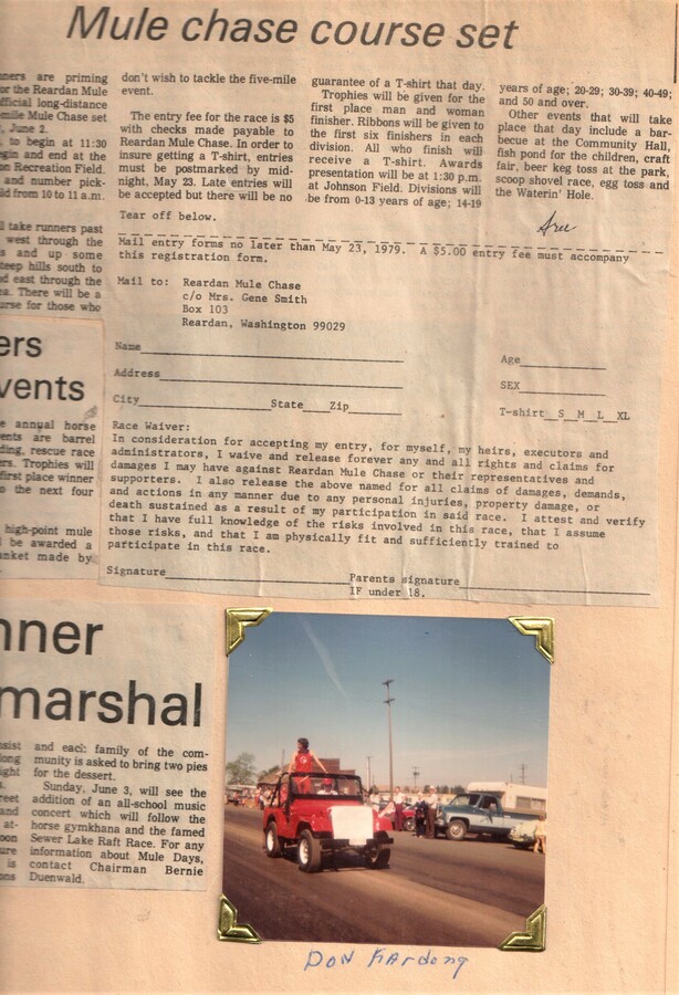 This page is from a scrapbook held by the Reardan Memorial Library about the Reardan Mule Days. 004